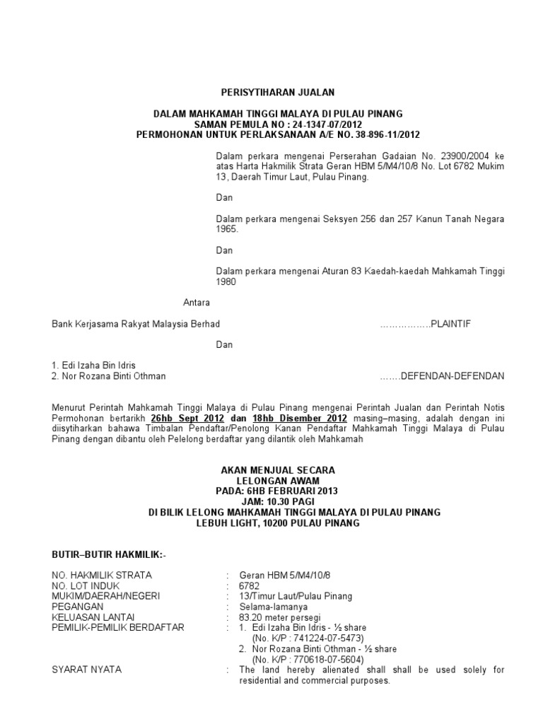 Dalam Mahkamah Tinggi Malaya Di Pulau Pinang Mpp Syarat Syarat Nyata First Grade The Land Pdf Document