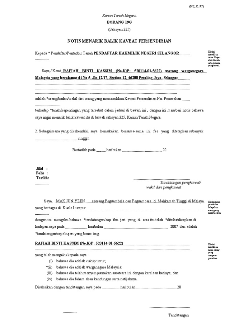 19b Pdf Nlc Kanun Tanah Negara Borang 19b Seksyen 323 Permohonan Untuk Memasukkan Kaveat Persendirian Kepada Pendaftar Pentadbir Tanah