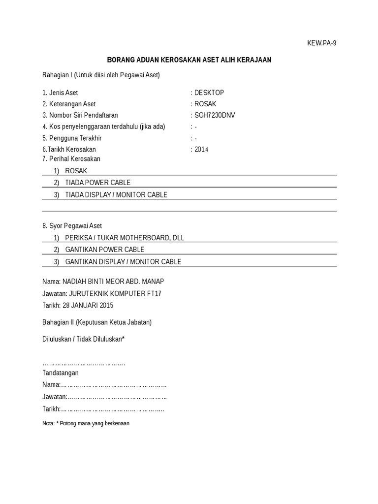 Borang Aduan Kerosakan Aset Alih Kerajaan Kewpa 9 Doc Document