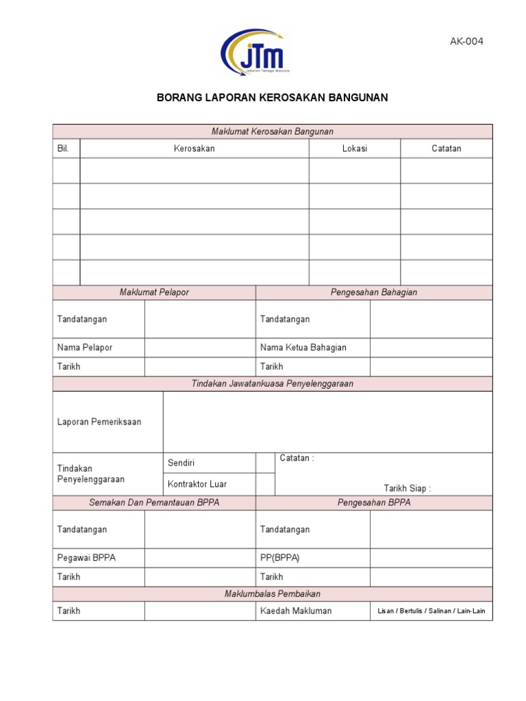 124100640 Borang Laporan Kerosakan Bangunan Doc Document