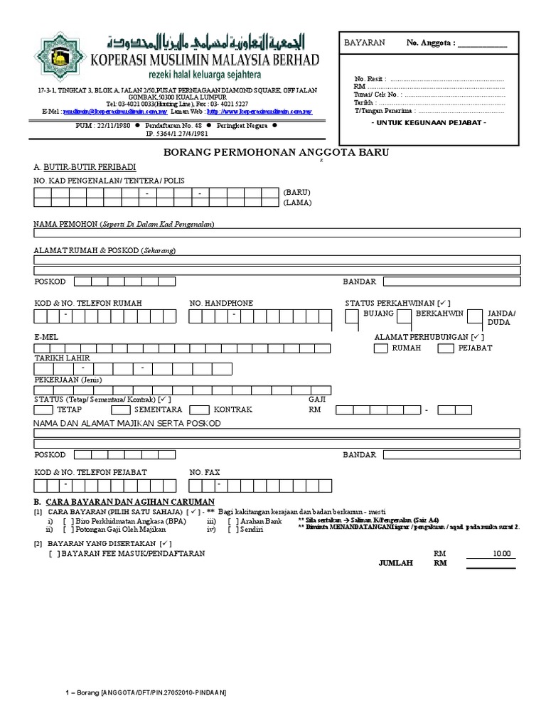 Posted by koperasi muslimin m bhd at 19 28 0 comments. Borang permohonan menjadi anggota member application form pemberhentian ahli koperasi sejati berhad dan pemberhentian potongan gaji yuran keahlian di perkhidmatan biro angkasa member resignation. Anda hanya perlu mengisi borang permohonan di sini. Di e daftar anda tidak perlu lagi hadir ke pejabat kmmb untuk berdaftar sebagai ahli.