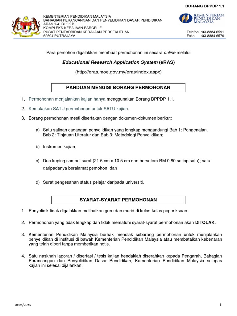Mulai 1 disember 2017 bahagian perancangan dan penyelidikan dasar pendidikan bppdp akan menggunakan sistem eras 2 0 untuk menerima permohonan dan mengeluarkan surat keputusan permohonan kebenaran menjalankan kajian. Satu salinan instrumen kajian. Satu salinan ringkasan kertas ilmiah disediakan mengikut format yang ditetapkan 7 15 muka surat. Salinan surat jemputan pembentangan.