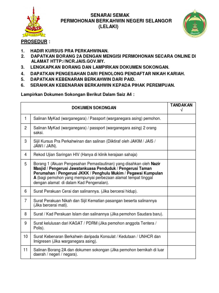 Senarai Semak Permohonan Berkahwin Ncr Jais Gov My Images Senaraisemakp Senarai Semak Permohonan Berkahwin Negeri Selangor Lelaki Prosedur 1 Hadir Kursus Pra Perkahwinan 2 Dapatkan Borang 2a Dengan Mengisi Permohonan Secara Online