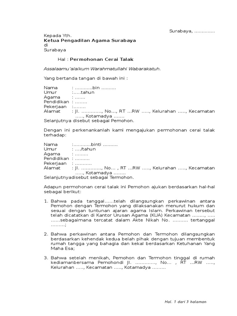 Contoh Surat Permohonan Cerai Talak Gudang Surat