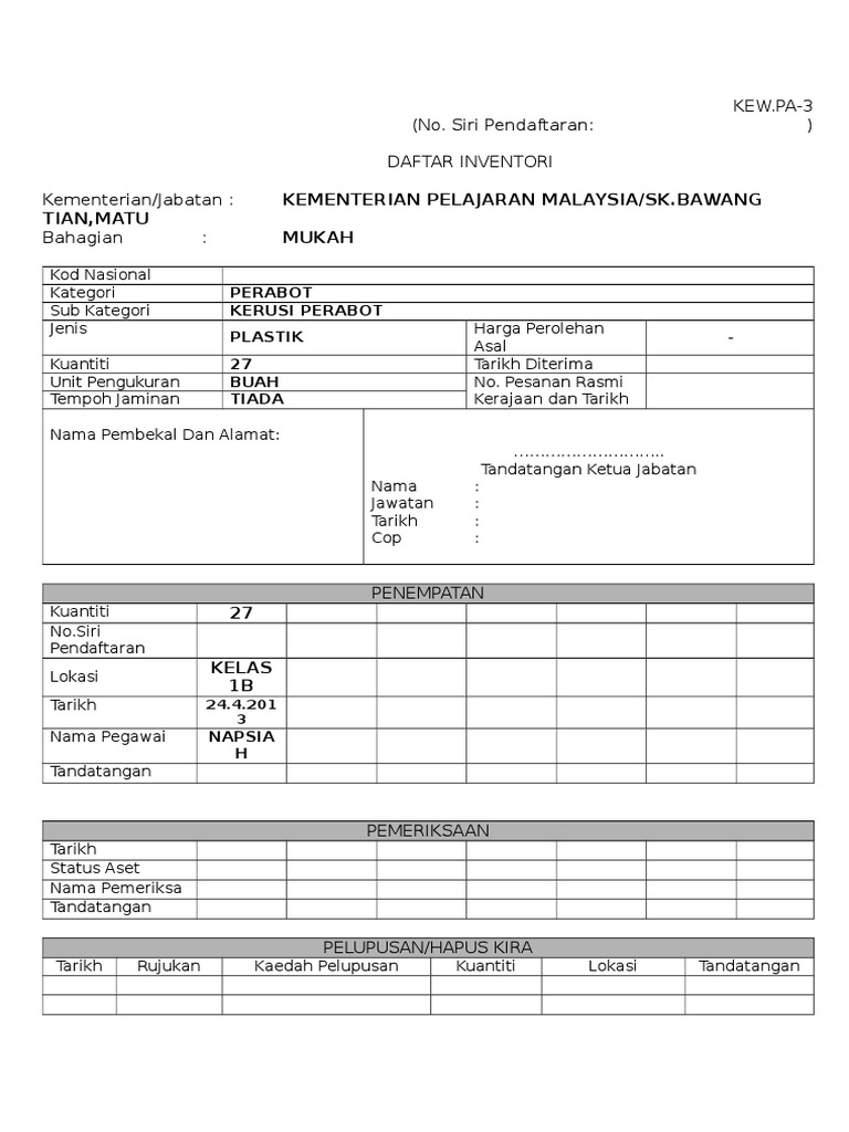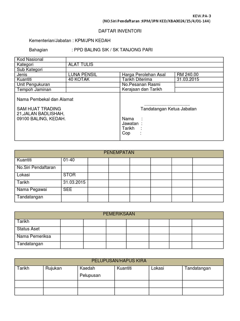 Borang Daftar Inventori Kew Pa 3