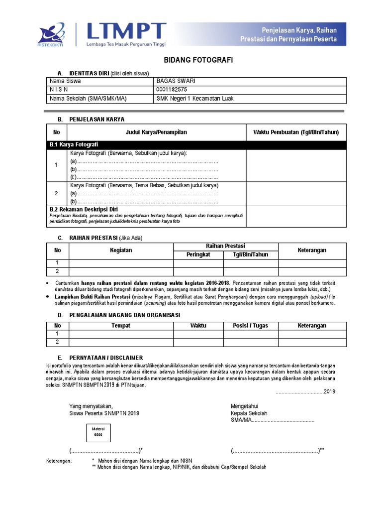 Borang Isian Raihan Prestasi Penjelasan Karya Dan Pernyataan Peserta Fotografi