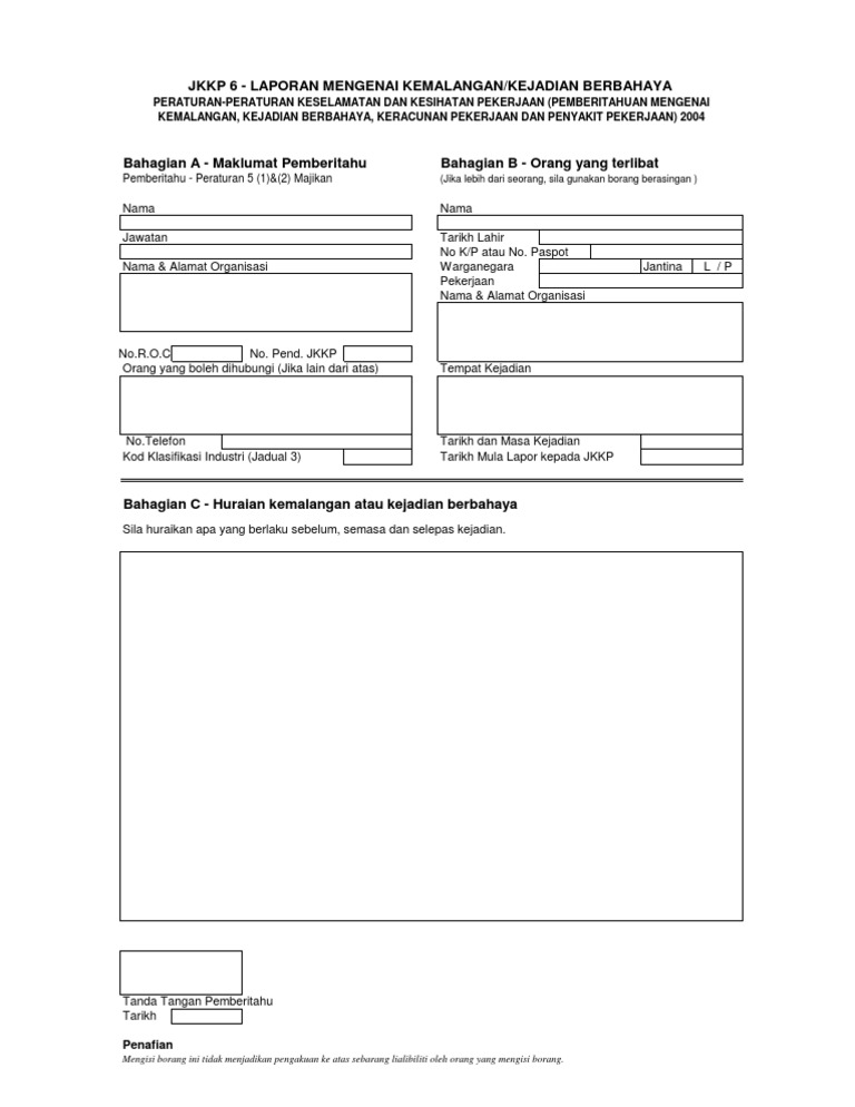 Jkkp 6 report for occupational accident dangerous occurrence part a detail of notifier notification of accident dangerous occurrence occupational poisoning and occupational disease 2004. Borang ini digunakan untuk melaporkan keracunan atau penyakit tempat kerja. Borang ini telah dibangunkan dengan konsep membenarkan kesemua maklumat yang diperlukan kecuali tandatangan terus diisi ditaip dengan menggunakan komputer. Jkkp 6 mengisi borang ini tidak menjadikan pengakuan ke atas sebarang liabiliti oleh orang yang mengisi borang.