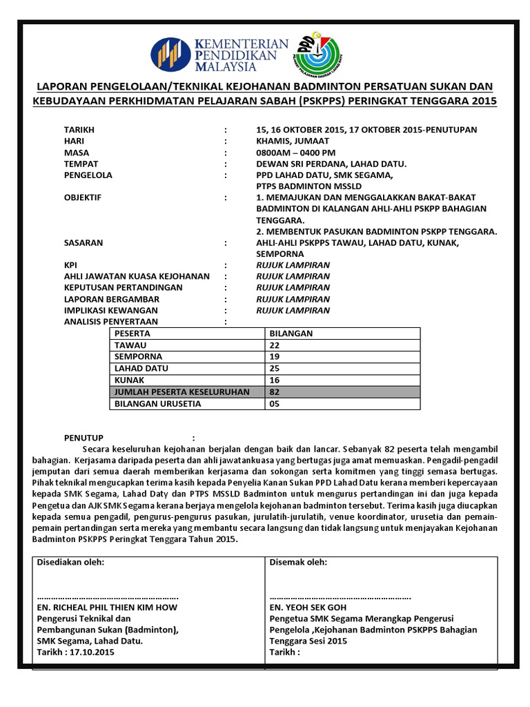 Laporan Pengelolaan Badminton Pskpps Bahagian Tenggara Negeri Sabah 2015