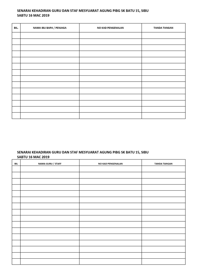Senarai Kehadiran Guru Dan Staf Mesyuarat Agung Pibg Sk Batu 15 Sibu Sabtu 16 Mac 2019