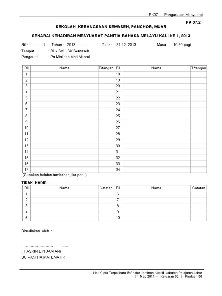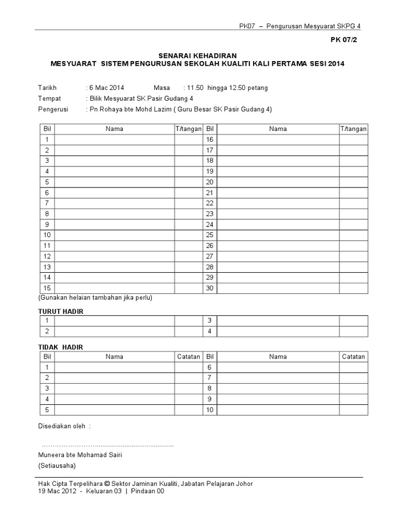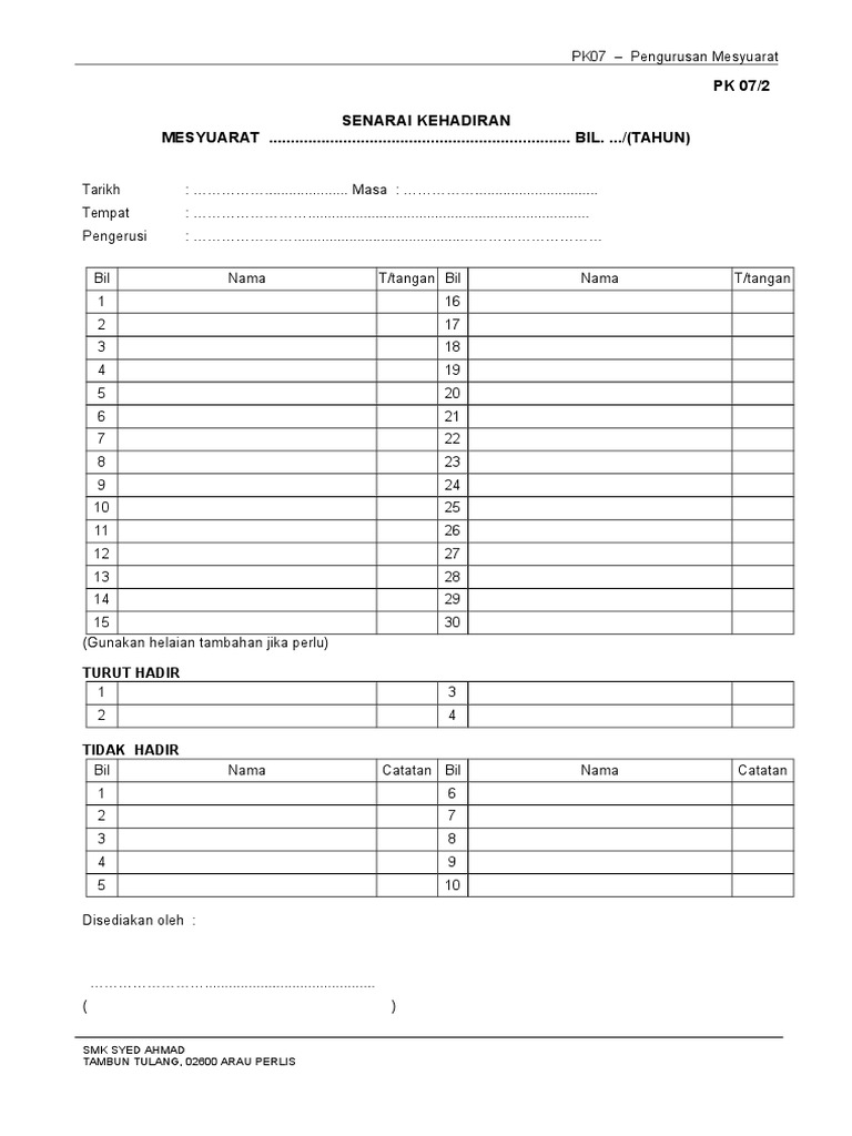 Contoh Borang Pk 07 2 Senarai Kehadiran Mesyuarat