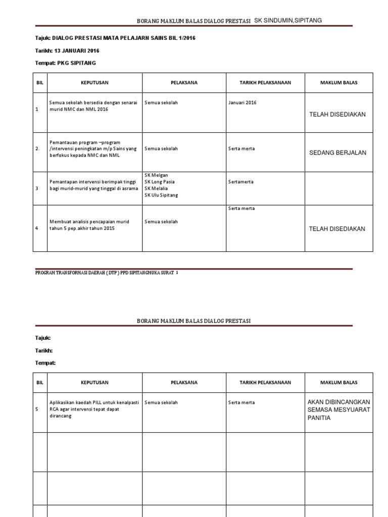 Borang Maklum Balas Keputusan Dialog Prestasi Daerah Bil 1 2016 Ppd Lubok Antu Docx