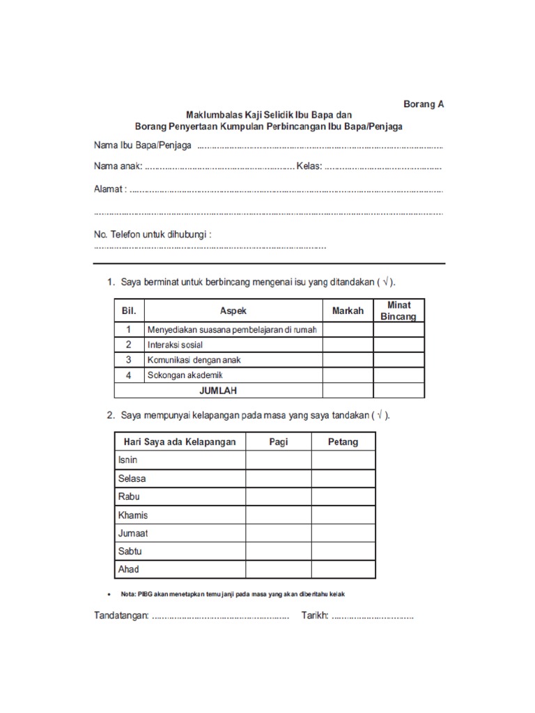 Borang Maklum Balas Kehadiran Ibu Bapa