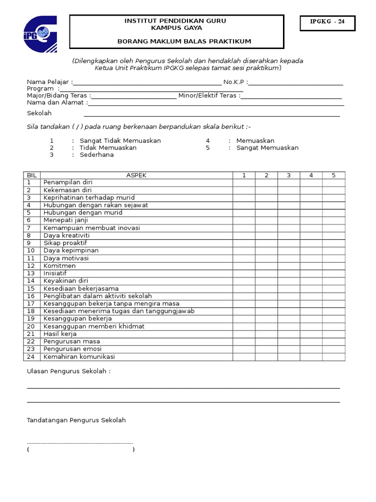 Borang Maklum Balas Praktikum Ipgkg 24