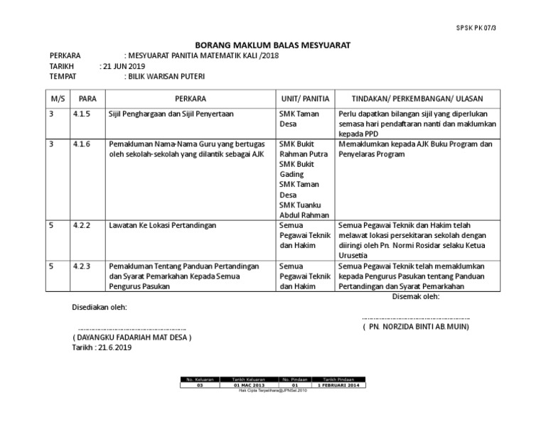 Pk07 3 Borang Maklum Balas Minit 1 2018 Bm