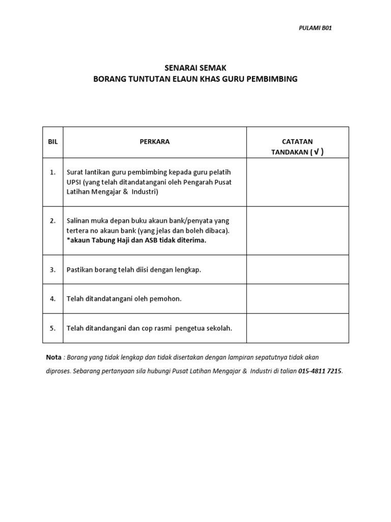Senarai Semak Borang Tuntutan Elaun Khas Guru Pembimbing Bil Perkara Catatan Tandakan