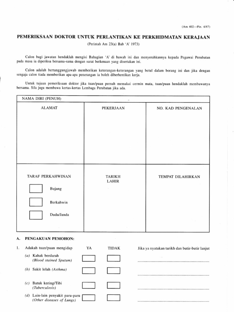 Berdasarkan borang pemeriksaan yang dikeluarkan oleh kementerian perubatan kesihatan malaysia am 402 pin 4 87 berdasarkan ketetapan dalam ruangan 2 bilangan 1jadual b pekeliling perkhidmatan bilangan 4 tahun 2012 pelaksanaan urusan perkhidmatan pegawai perkhidmatan awam persekutuan di bawah sistem saraan malaysia.
