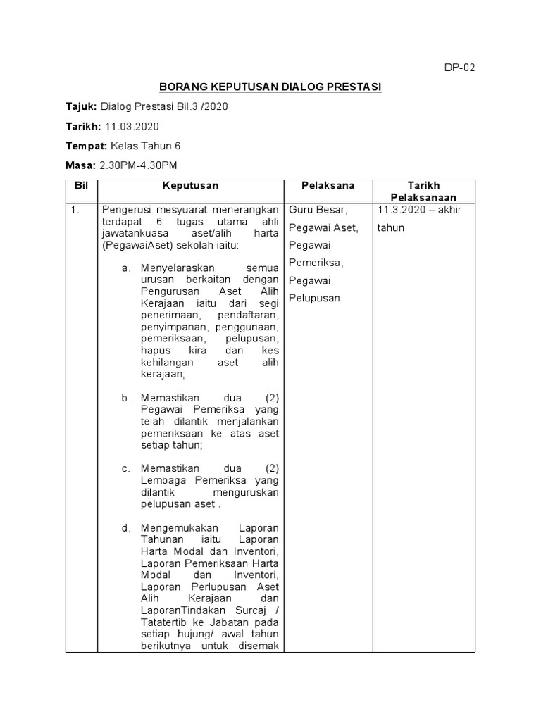 Borang Keputusan Dialog Prestasi Tajuk Dialog Prestasi Bil 3 2020 Tarikh 11 03 2020 Tempat Kelas Tahun 6 Masa 2 30pm 4 30pm Bil Keputusan Pelaksana Tarikh Pelaksanaan
