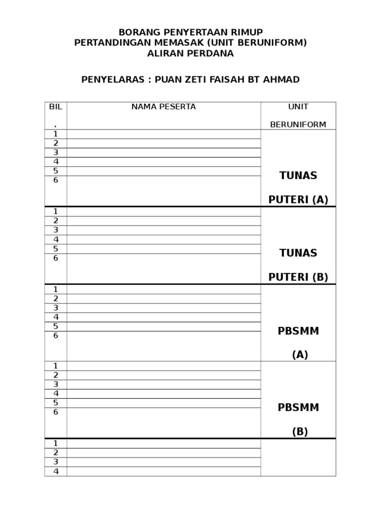 Borang Penyertaan Pertandingan Memasak Badan Beruniform