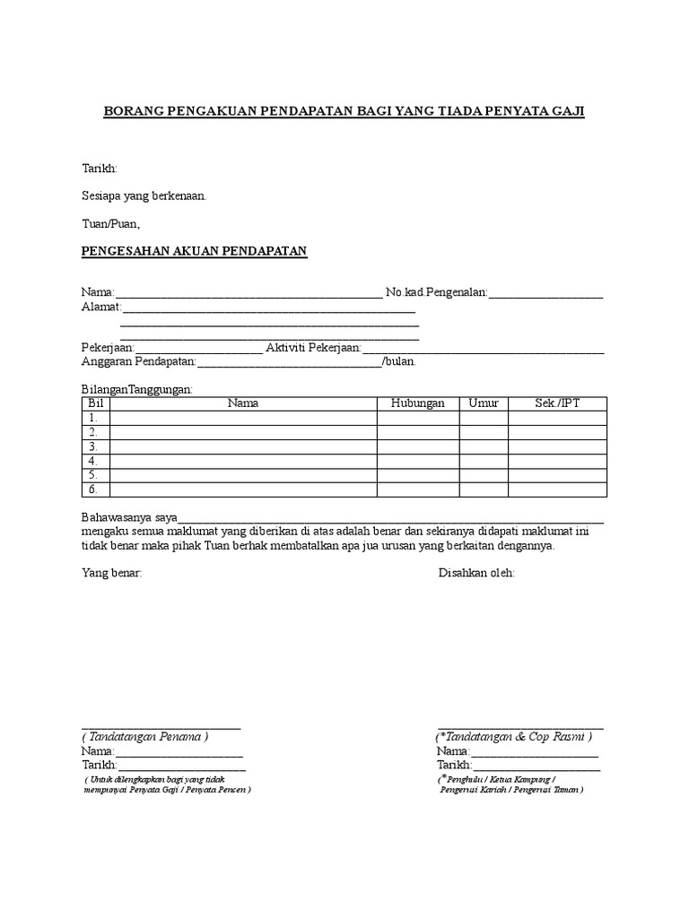Borang Pengesahan Pendapatan Tanpa Slip Gaji