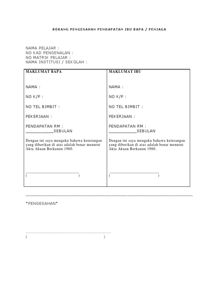 Borang Pengesahan Pendapatan Ibu Bapa Sekolah