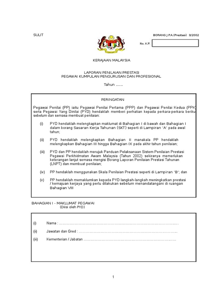 Borang penilaian prestasi terkini 2 februari 2019. Spp bil 21 1972 i borang laporan sulit tahunan jpa 1 70 pin. Published in pengurusan prestasi. Borang penilaian prestasi pegawai pegawai bahagian i.