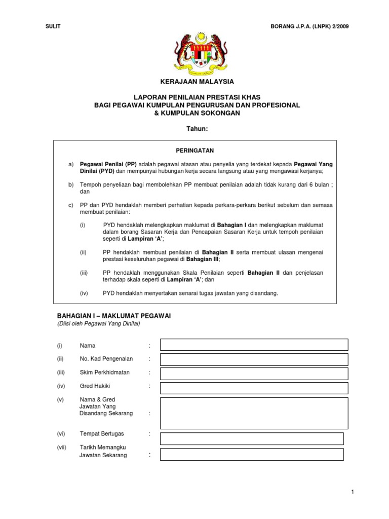 Kerajaan Malaysia Laporan Penilaian Prestasi Khas Bagi Pegawai Kumpulan Pengurusan Dan Profesional Kumpulan Sokongan