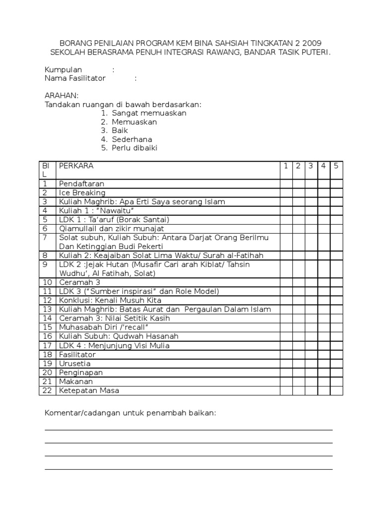 Doc Borang Penilaian Keberkesanan Kem Kepimpinan Shahrul Nizam Academia Edu