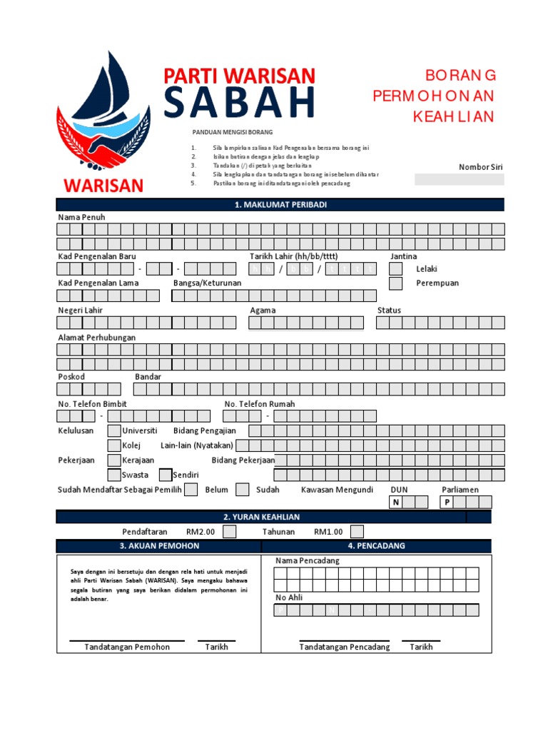 Borang Permohonan Keahlian Parti Warisan Sabah