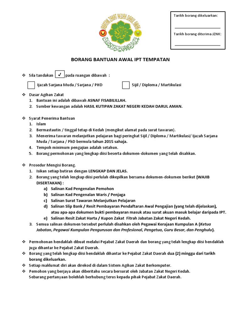 Senarai Semak Lembaga Zakat Negeri Kedah Darul Aman Bantuan Ini Adalah Dibawah Borang Dermasiswa