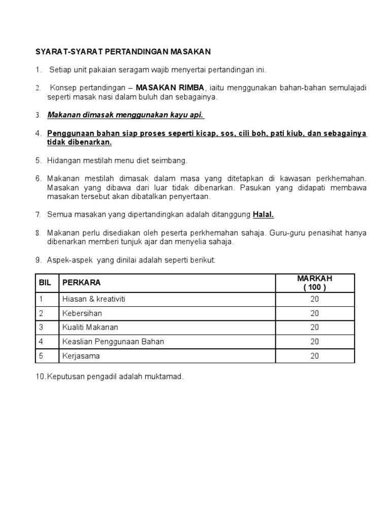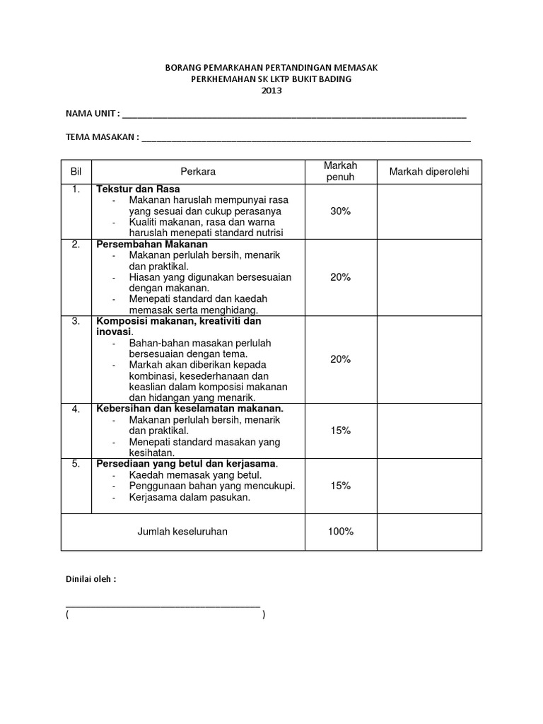 Borang Pemarkahan Pertandingan Memasak Docx Document
