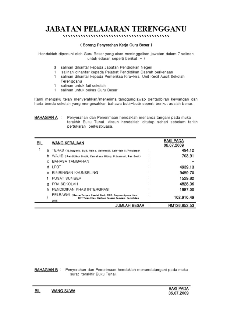 Borang serah tugas guru besar. Surat penyerahan dan akuan nota serah tugas 2. Kedudukan terakhir tugas tugas yang belum diselesaikan nyatakan peratus tugasan yang telah disiapkan dan yang belum disiapkan 4. Nota serah tugas gpk dan guru biasa 8 nota serah tugas guru besar 9 contoh skt guru 9 contoh skt guru besar 10 borang laporan penilaian prestasi khas. Nota serah tugas mesti disiapkan sebelum berpindah dan lengkap ditandatangani oleh guru besar dan pegawai yang menerima tugas daripada pegawai bertukar.