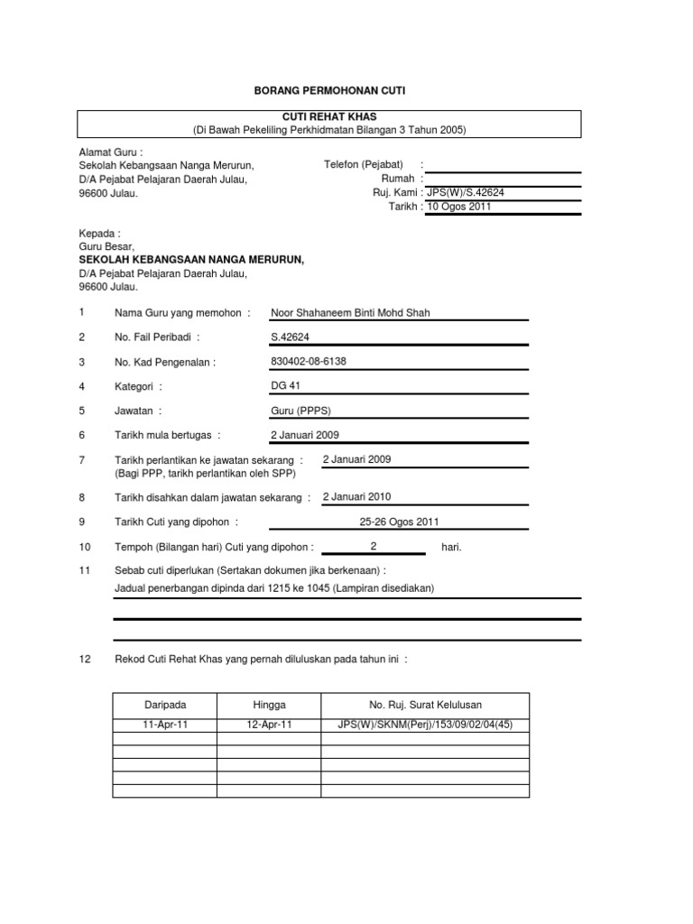 Borang Pengumpulan Cuti Rehat Khas Guru