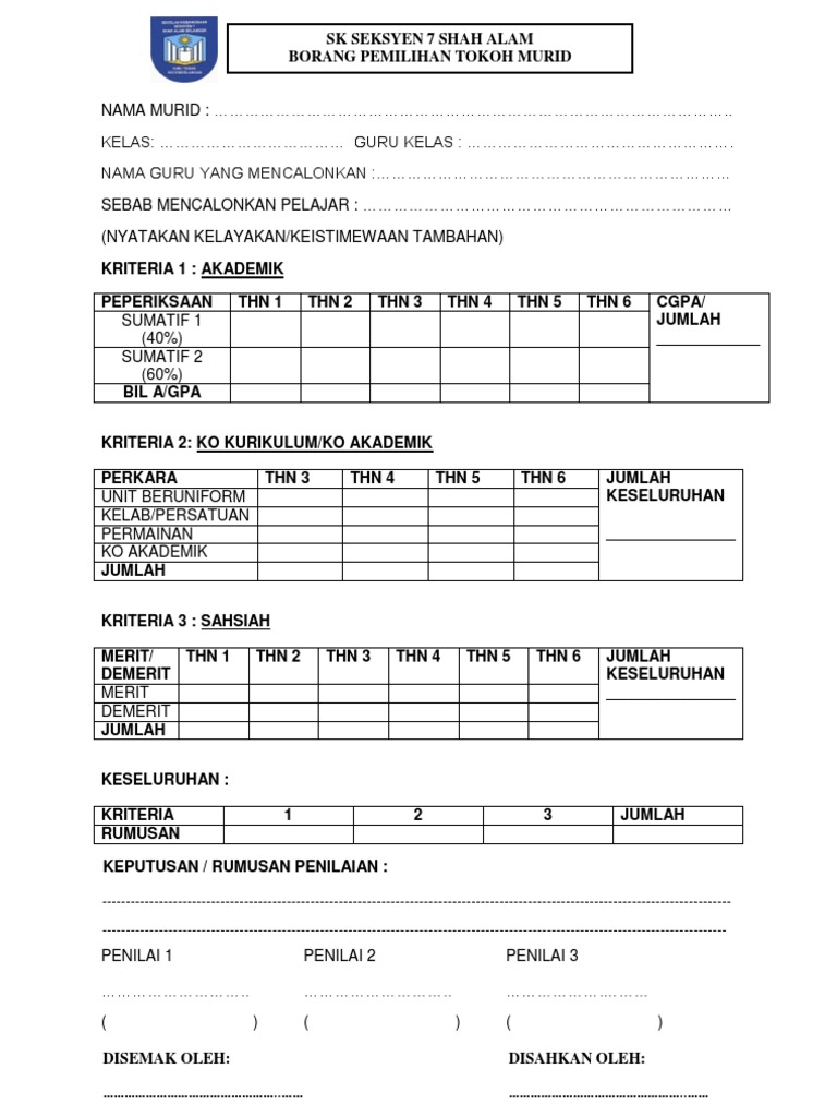 Cth Borang Pemilihan Tokoh Murid 2012