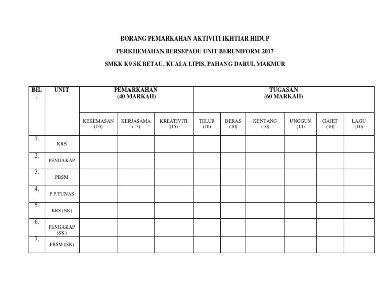 Doc Borang Pemarkahan Aktiviti Perkhemahan Perdana Unit Beruniform Smk Inanam 2014 Aktiviti Tarikh Masa Bil Kumpulan Kriteria Kriteria 1 Kriteria 2 Kriteria 3 Kriteria 4 Kriteria 5 Kriteria 6 Jumlah Kedud Kan Momo Berry Academia Edu