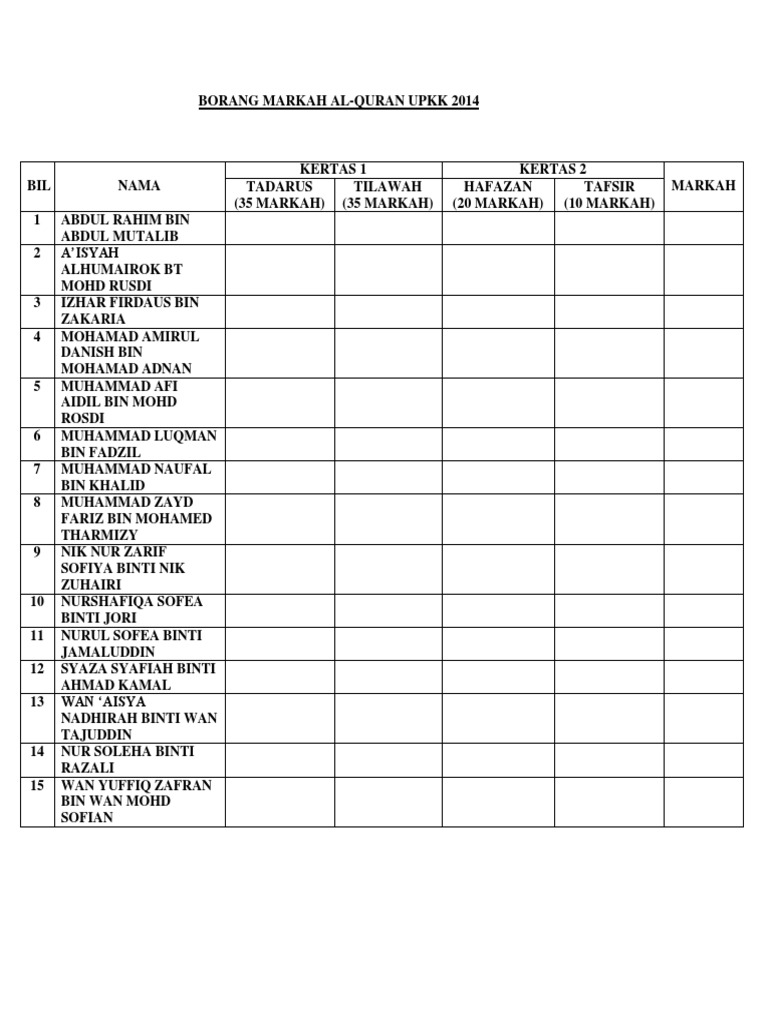Borang Semakan Hafazan Dan Tilawah Upkk 2014m