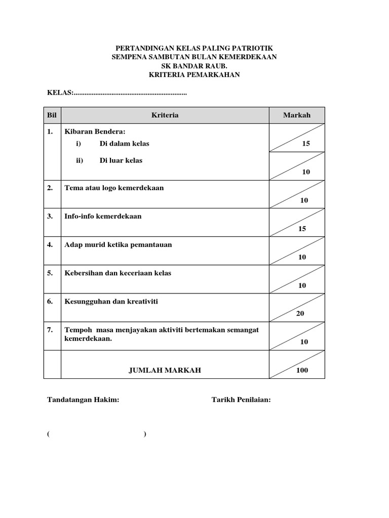 Contoh borang pemarkahan keceriaan kelas. Borang pemarkahan pertandingan keceriaan kelas sempena sambutan kemerdekaan 2014 saya telah diberi tanggungjawab untuk memberikan markah kepada semua kelas yang telah menyertai dalam pertandingan menghias kelas sempena sambutan hari kemerdekaan 2014. Papan kenyataan hadapan maklumat kelas dan maklumat sekolah dan papan kenyataan belakang visi dan misi peraturan kelas jadual waktu pelan. Kelas anda telah menyertai pertandingan keceriaan. Contoh borang markah pertandingan kebersihan dan keceriaan kelas.