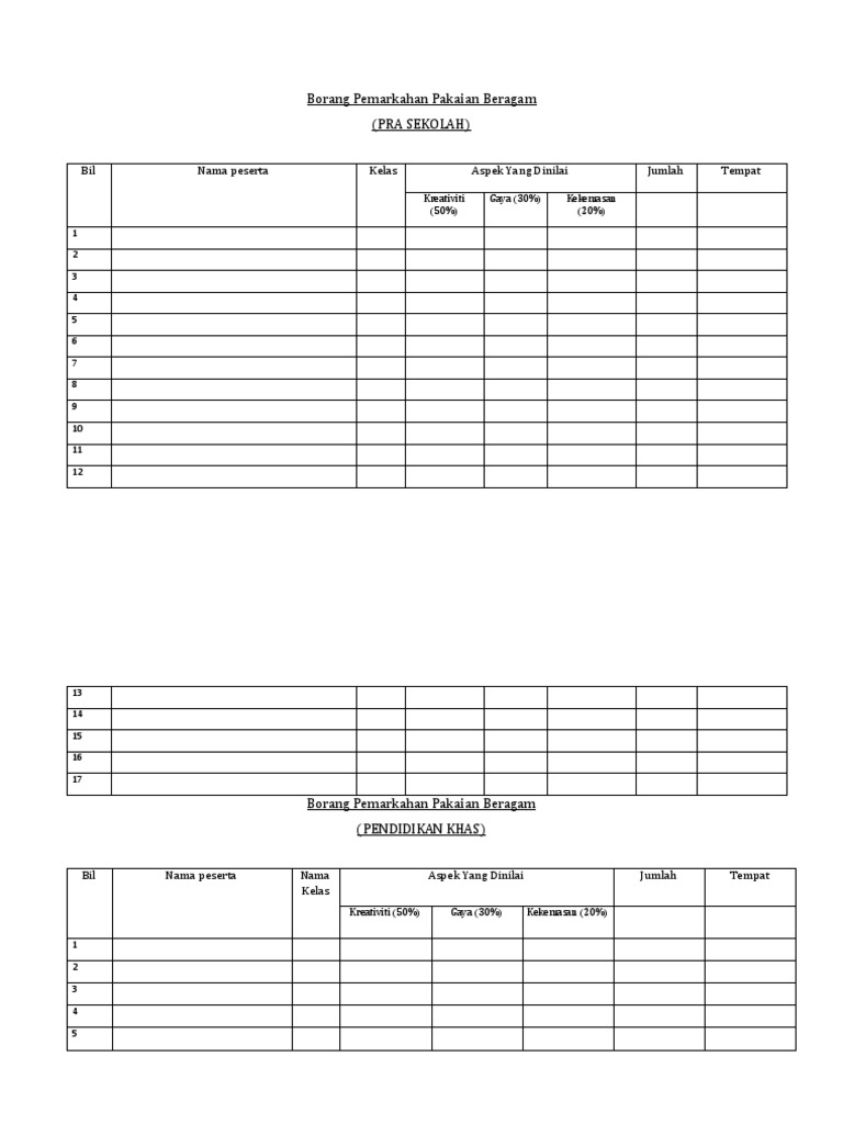 Borang Pemarkahan Pakaian Beragam Pra Sekolah Bil Nama Peserta Kelas Aspek Yang Dinilai Jumlah Tempat