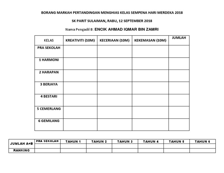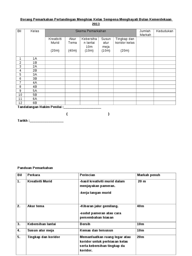Borang Pemarkahan Pertandingan Hias Kelas 2013 Doc Document
