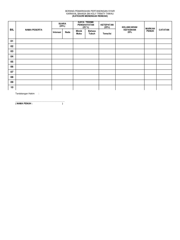 Borang Pemarkahan Pertandingan Deklamasi Sajak