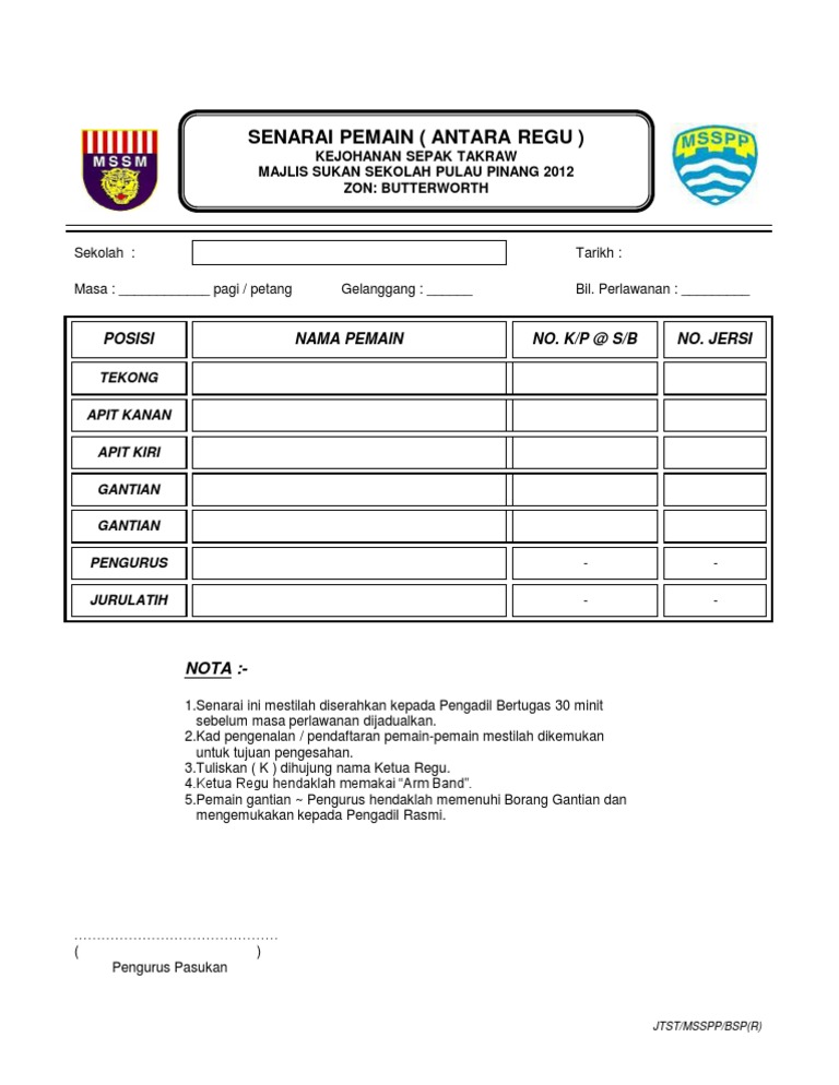Contoh Borang Pendaftaran Sepak Takraw