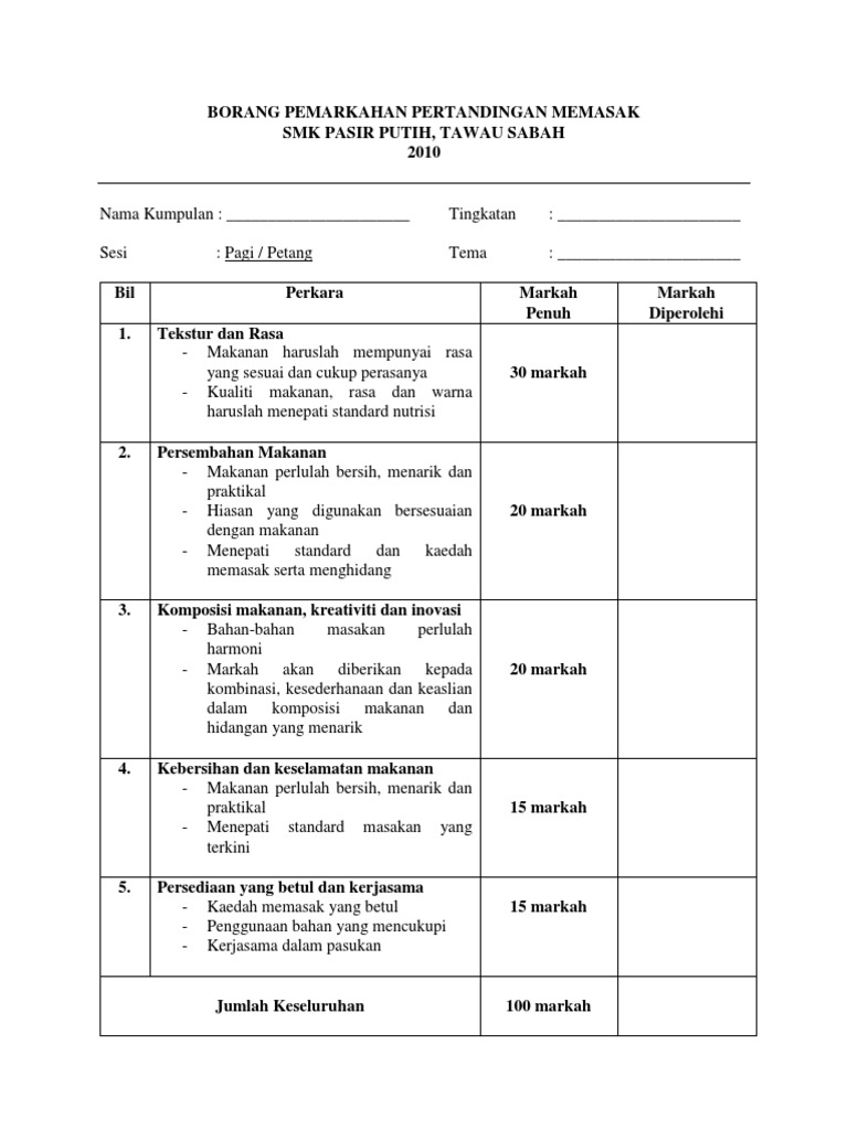 Image Result For Borang Pemarkahan Pertandingan Memasak Image