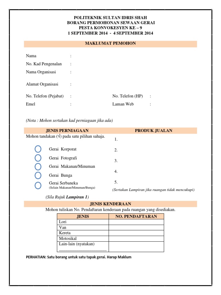 Contoh Borang Sewa Tapak Gerai