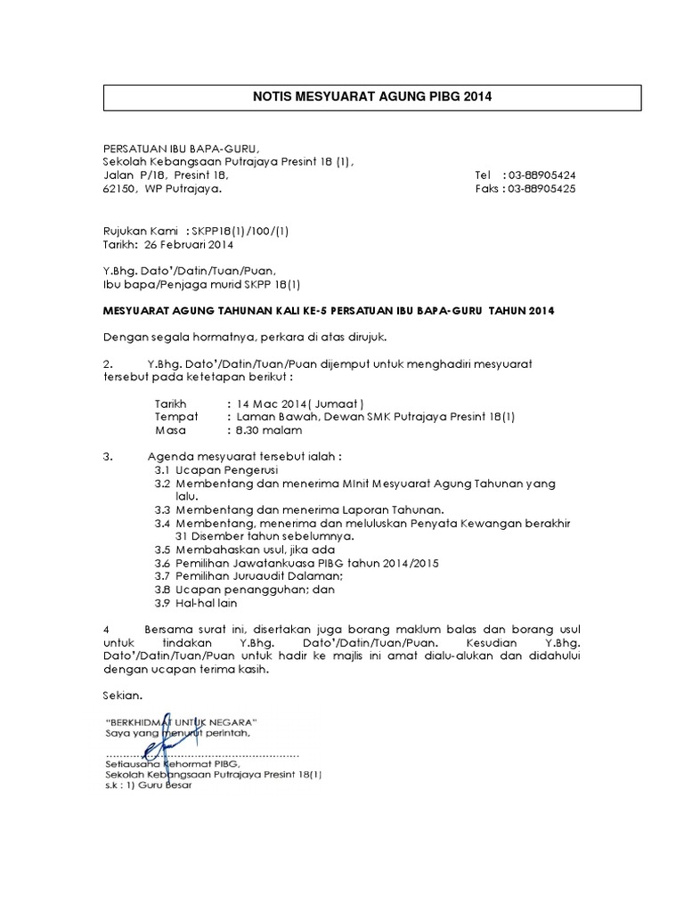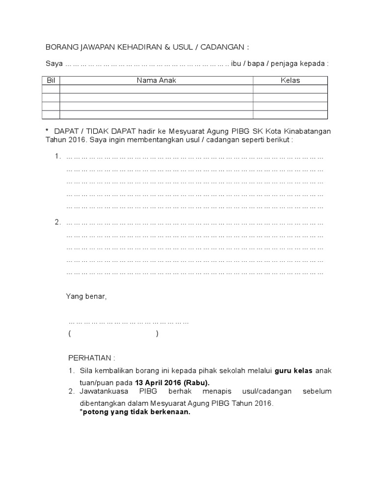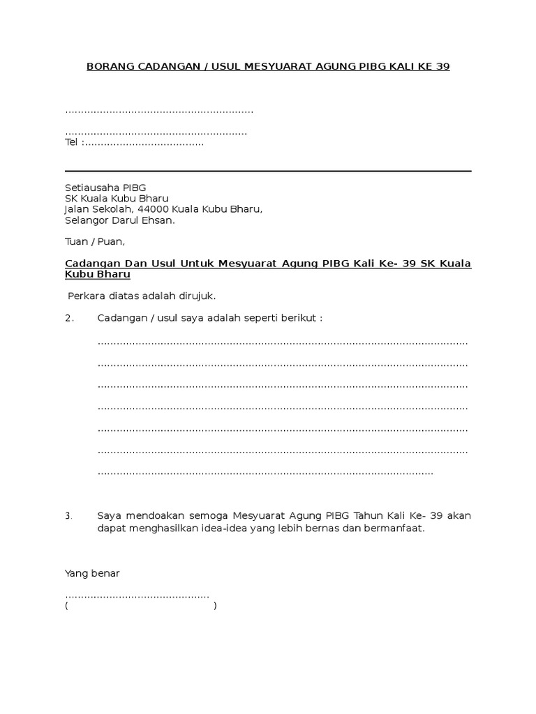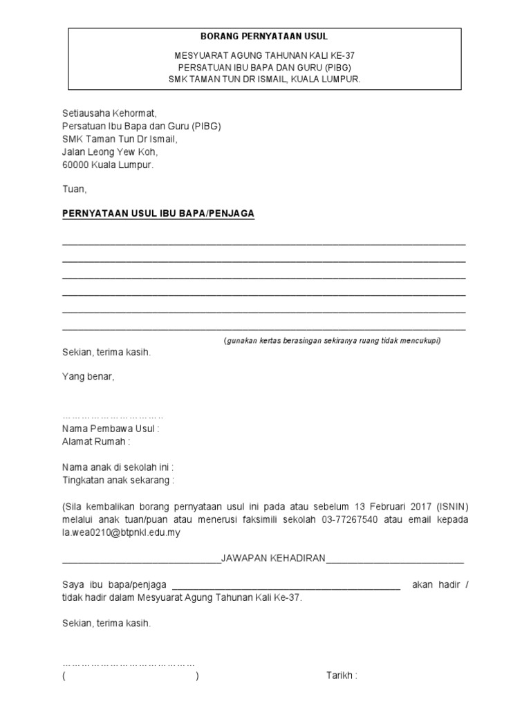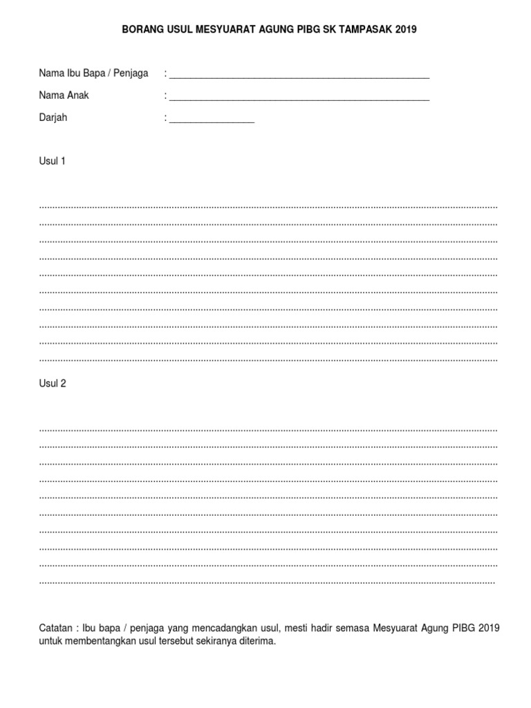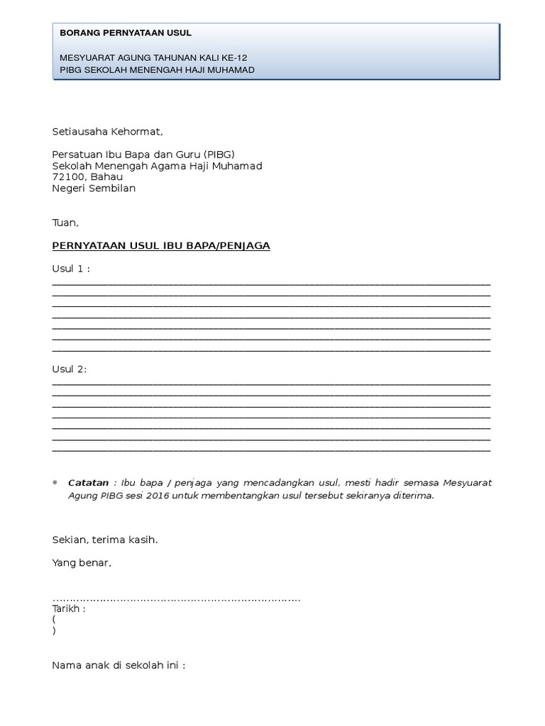Contoh Borang Usul Mesyuarat Agung Pibg