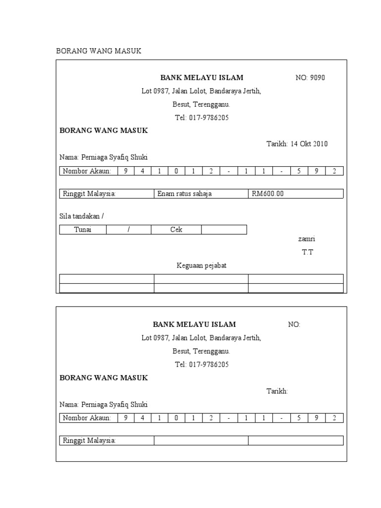 Contoh Borang Wang Masuk