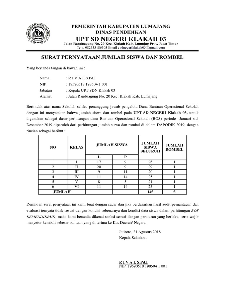 Surat Pernyataan Jumlah Murid 2018 Sdn Klakah 3